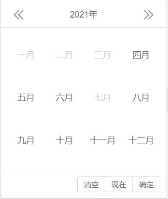 function initMonth(){ ajaxSumbit("${ctx}/monthReview/getIsHasMonth.action","POST", {},function(data){ var date = data.date; var datas = data.data;//格式为{'2022':'1,2,5'}; //年选择器 laydate.render({ elem: '#month' ,type: 'month' ,min: date//只可以选本月及以后 ,ready: function (value) { disabled_date(value.year,datas); } ,change: function(value, date, endDate){ disabled_date(date.year,datas); } }); }) }