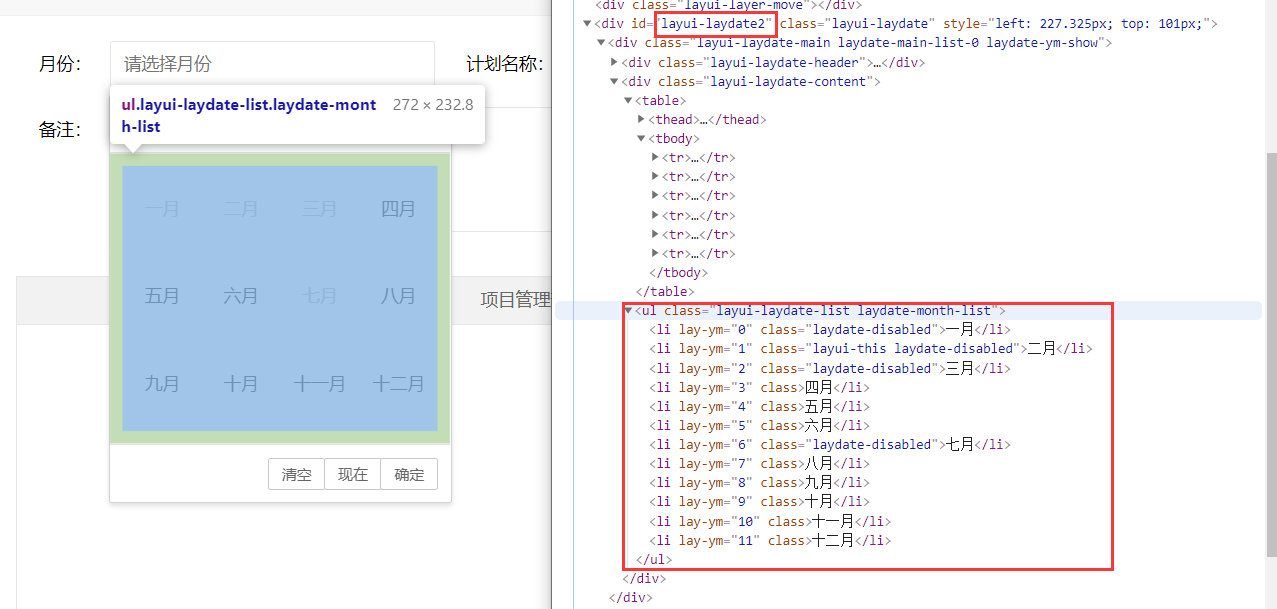 1.使用月选择器后,月份的dom并不和日期选择器一样,在table中。