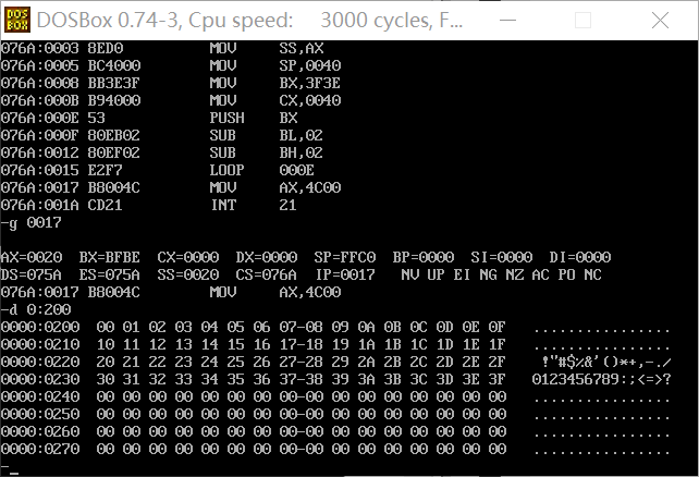 直接用g命令执行到程序结束之前,再用d命令查看0:200~0:23f,确认将数据0~3F传送到此段内存区域中,查看结果如下图: