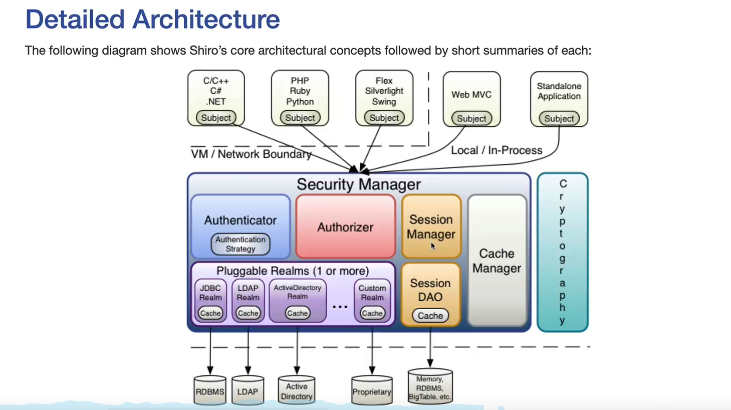 SecurityManager即安全管理器,对全部的subject进行安全管理,它是shiro的核心,负责对所有的subject进行安全管理。通过SecurityManager可以完成subject的认证、授权等,实质上SecurityManager是通过Authenticator进行认证,通过Authorizer进行授权,通过SessionManager进行会话管理等。