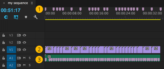 在节拍检测发生后,我们在Premiere Pro时间轴中为某些节拍生成序列标记(1)。然后,我们使用Premiere Pro中的Automate To Sequence功能自动生成基于这些标记的切割(2)。除了序列标记之外,我们还为音轨(3)中的所有节拍生成剪辑标记。如果我们想要稍后手动修改任何剪辑,同时仍然确保它们准确地放置在节拍的位置,这些作为指南很有用。