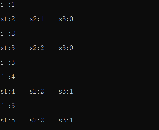 cout<<"s1:"<<s1<<'\t'<<"s2:"<<s2<<'\t'<<"s3:"<<s3<<'\n';