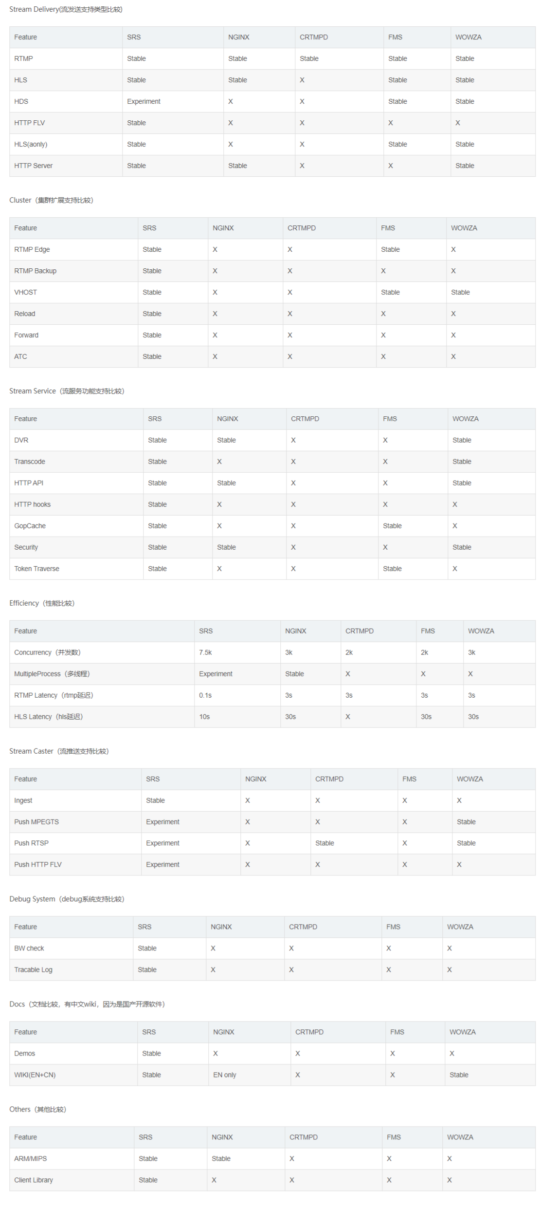 - 功能全面:支持RTMP/RTMPE/RTMPS/RTMPT/RTMFP流协议,AMF0/AMF3编码,SharedObject协议,HLS/HDS协议,直播和点播,支持服务器脚本,支持多码率,支持Windows和Linux平台。能想到的好像都能支持。SRS呢?可怜兮兮的只有RTMP/AMF0/HLS/直播/linux。