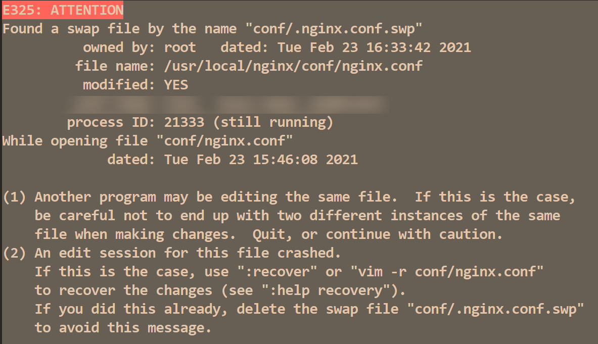 E325:ATTENTION是在调试nginx.conf时出现的,根据报错信息可以看到相应的问题。