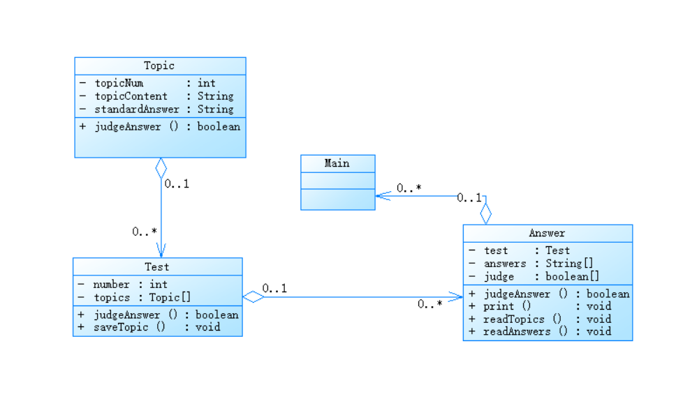 (1)Topic类:用于存储题目的题号,内容和标准答案,同时根据标准答案对答案进行批改。