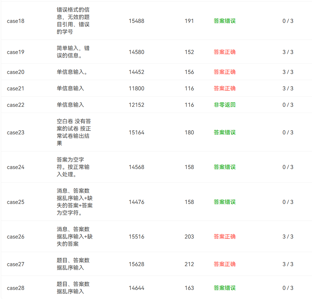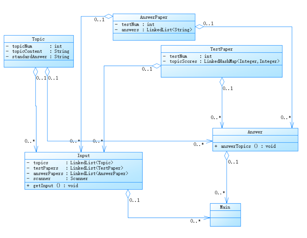 Answer类的主要功能就是从Input类中以及获取的各个链表,筛选出对应信息进行判分操作,在判完分后将结果输出出来。