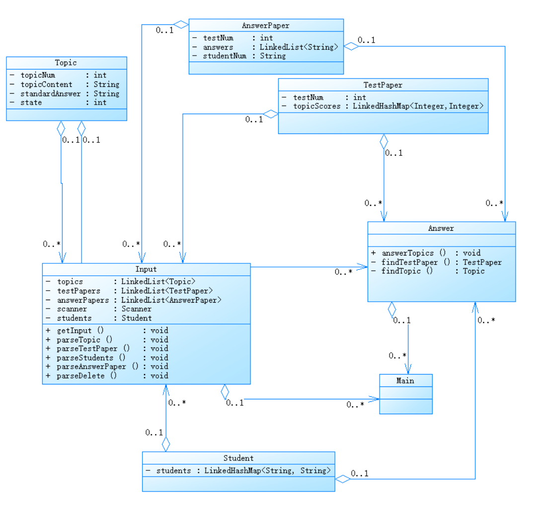 所以在Input类中我增加了parseTopic,parseTestPaper,parseStudents,parseAnswerPaper,parseDelete函数分别对不同的类的信息进行正则匹配。