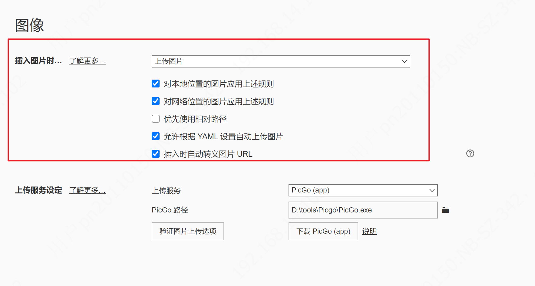 - 打开【设置】-【偏好设置】- 【图像】- 勾选【上传服务设定】