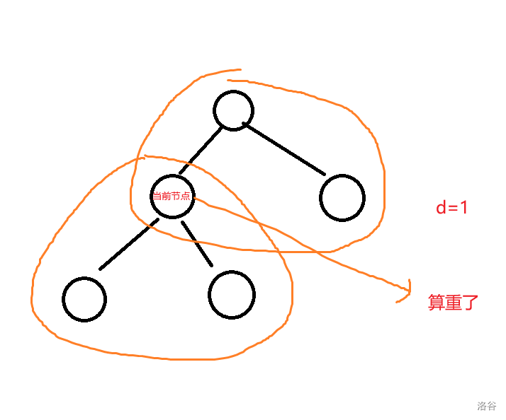然后我们考虑需要增加父亲节点的情况,先不考虑超时的问题,如果增加了父亲节点的情况我们每一次给自己以及父亲节点的位置向下扫 \(d\) 层会有算重的情况(如图):