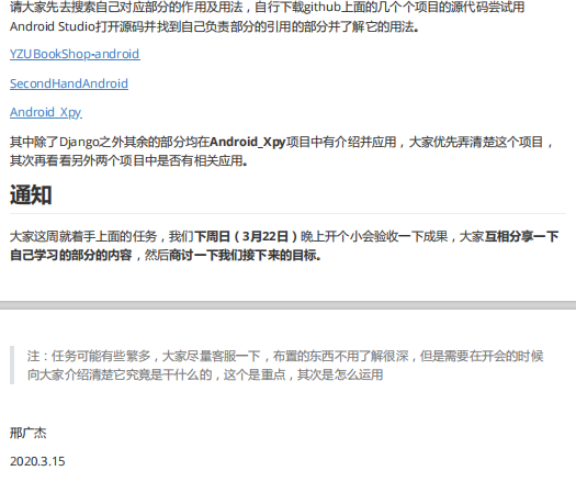 会议中大家都分享了各自的学习内容,大家的第一次的学习任务都完成的很好,对各自负责的内容都有所学习。由发言可以听出大家在这一周都比较用心的对内容进行了了解和学习。