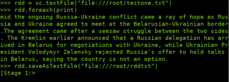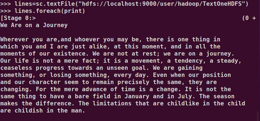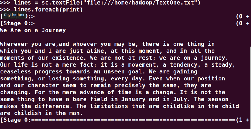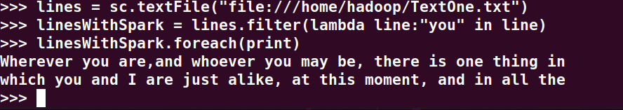 - 从本地文件系统中加载数据创建RDD将本地文件TextOne.txt中的数据导入RDD中