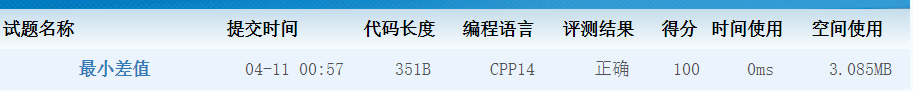 #include <iostream> #include <algorithm> using namespace std; const int N = 1010; int n, sum[N], q[N]; int main() { cin >> n; for (int i = 1; i <= n; i ++ ) scanf("%d", &q[i]); sort(q + 1, q + n + 1); for (int i = 2; i <= n; i ++ ) sum[i - 1] = q[i] - q[i - 1]; sort(sum + 1, sum + n); cout << sum[1] << endl; return 0; }
