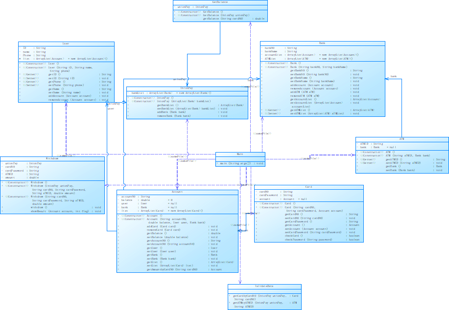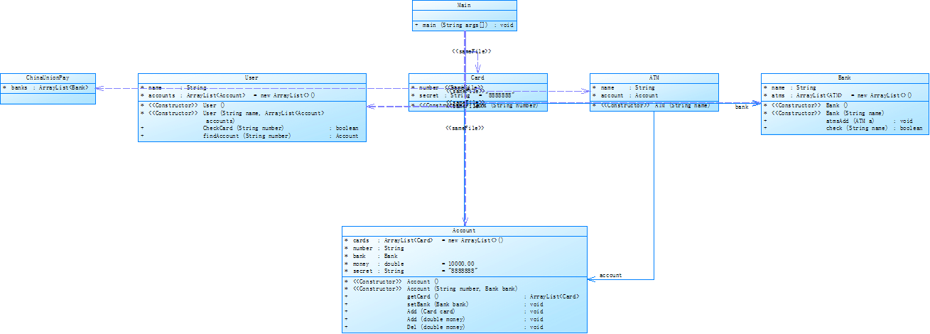 银行的设计总体来讲还是有难度的,在ATM1.0中考虑了很久,类和类之间的关系应该如何设计,应当如何运用聚合,关联,依赖关系,后来再自己写了一篇以及老师给出讲解后思路也一下子清晰了起来,2.0版本根据源代码进行改动就显得得心应手了,通过这次作业也对java类之间的关系有了一个更加清晰的了解和掌握。