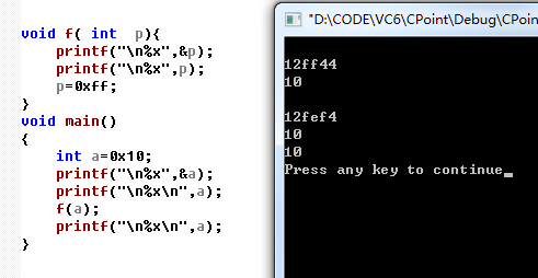 通过上例我们可以看到,int a=0x10,存放的地址为0x12ff44,值为10,当调用f(a)时,传递给p的值为10,但是p的地址为0x12fef4,当改变p=0xff,时是改变地址为0x12fef4中的内容,并没有改变0x12ff44中的内容,所以调用f(a),后a的值仍然为0x10,所以值传递无法改变变量的值。示意图如下: