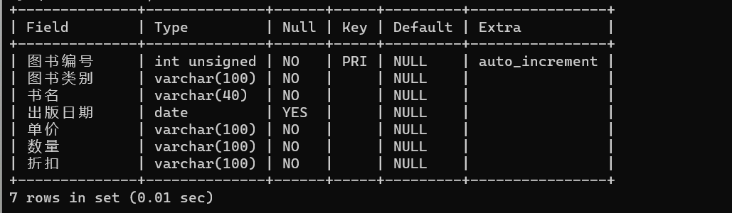 PRIMARY KEY(图书编号)主键对应的第一行的属性之前把auto该成不自动就报错了