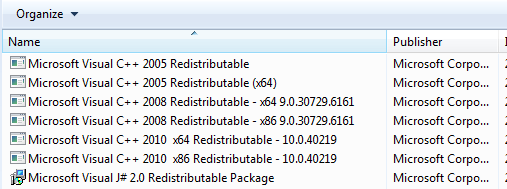 最近在添加与删除程序中发现,系统中Microsoft Visual C++ Redistributable Package存在很多版本的,从2005、2008、2010都有,而且同一个发行版下还存在多个版本的。这都是安装visual studio(我只安装了visual studio 2012)、各类软件自带的发行包搞的。