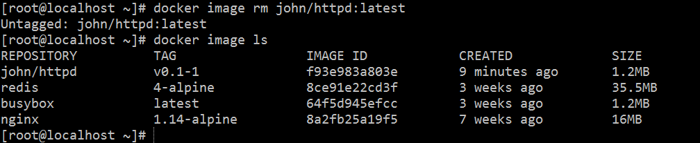 另外一点是,docker import可以指定IMAGE[:TAG],说明我们可以为镜像指定新名称。如果本地镜像库中已经存在同名的镜像,则原有镜像的名称将会被剥夺,赋给新的镜像。原有镜像将成为孤魂野鬼,只能通过IMAGE ID进行操作。