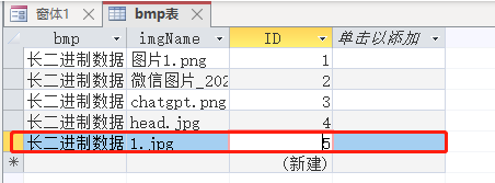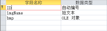 第一步我们还是很常规的,先来创建一张表,放上两个字段,一个imgName用户存放文件的名称,另一个是bmp是用来保存附件。