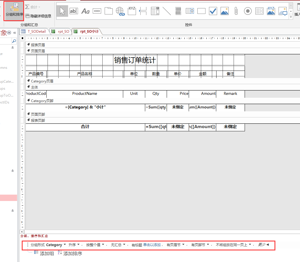 接着,我们增加分组和排序,这里我们需要按分类(Category)进行分组排序,需要要有页眉与页脚。