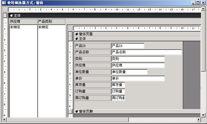 | 列表框 | lstSort | 行来源类型 | 表/查询 | 显示产品类别列表 |