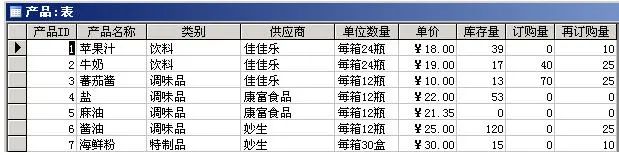 现在通过示例程序来对其进行说明,由于此功能是对数据的处理,所以需要基于一个有数据的表,这里我们用如图1、图2所示的“产品”表来做为例程表: