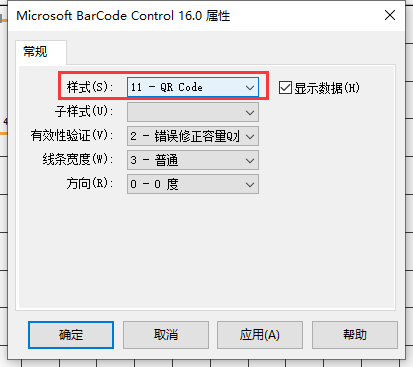 在弹出的属性对话框中样式的属性选择11-QR Code ,然后点击应用。