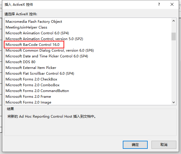 c、在弹出的对话框窗体中选择Microsoft BarCode Control 16.0