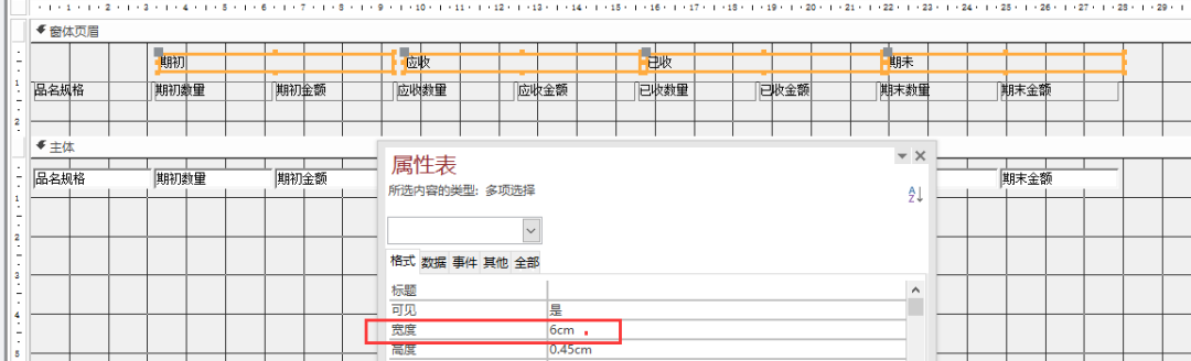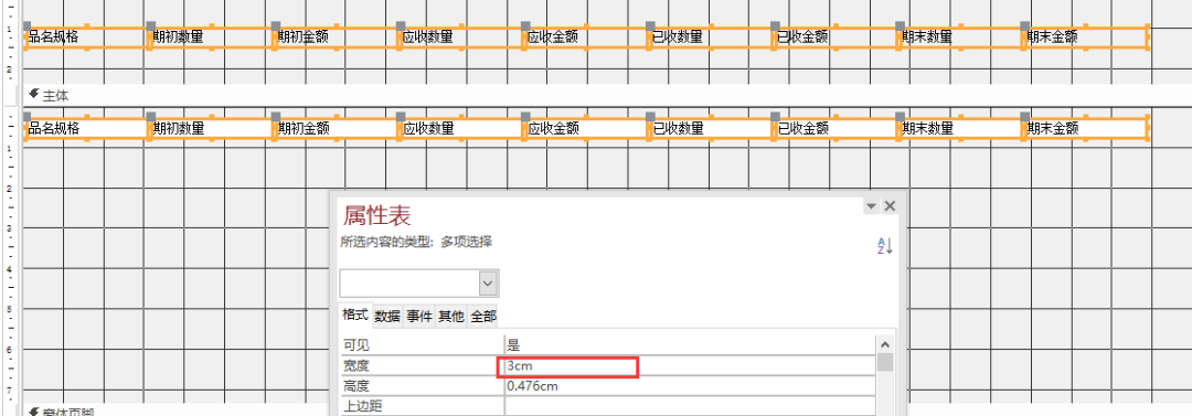 接下去就需要调整细节了,先将“品名规格”标签的宽度调整成1cm,其他的几个标签的高度改成0.5cm