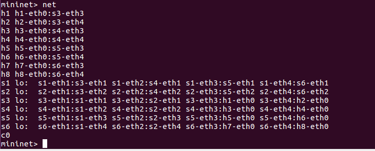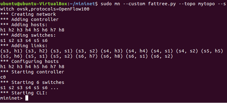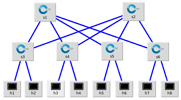 4. 利用Python脚本完成如下图所示的一个Fat-tree型的拓扑(交换机和主机名需与图中一致,即s1~s6,h1~h8,并且链路正确,请给出Mininet相关截图)
