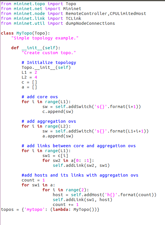 在/home/mininet/目录下添加fattree.py脚本,其中