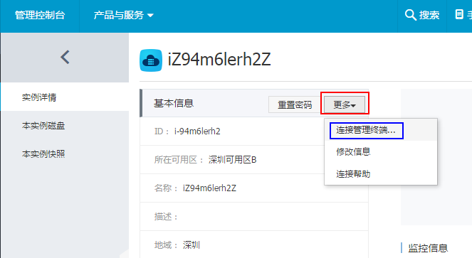 在刚才“重置密码”的旁边有个“更多”按钮,点开下拉菜单即可找到“连接管理终端”的选项。