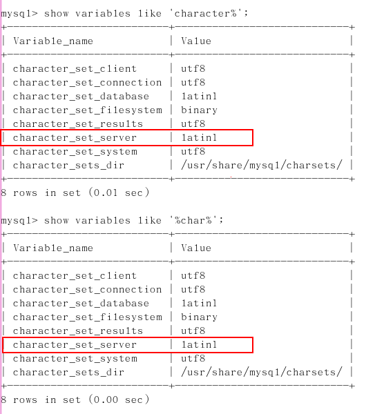 先查看字符集:show variables like 'character%'; 看到默认使用的字符集是latin1