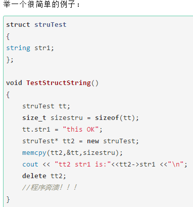 在C语言中,使用memset清空内存是常用操作,在C++中,和malloc一样,使用memset直接操作内存是有很大风险的,因为它们都只是在内存层面做了改动,但是对类对象本身却没有任何行动,也就是说,他们不会调用类对象的构造或者析构函数,如果我们的结构体中含有string类型的成员,直接使用memset很可能导致内存泄漏!