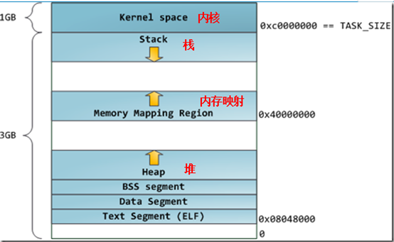 从图中,我们也看见,堆是自下而上的,栈是自上而下,两个是相向的,如果不是特殊情况下,分界线是0x40000000~~
