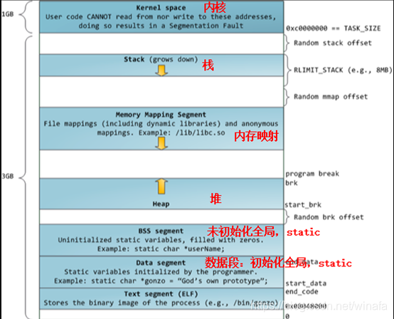 Linux通过对栈、内存映射段、堆的起始地址加上随机偏移量来打乱布局,以免恶意程序通过计算获取访问栈、库函数等地址。