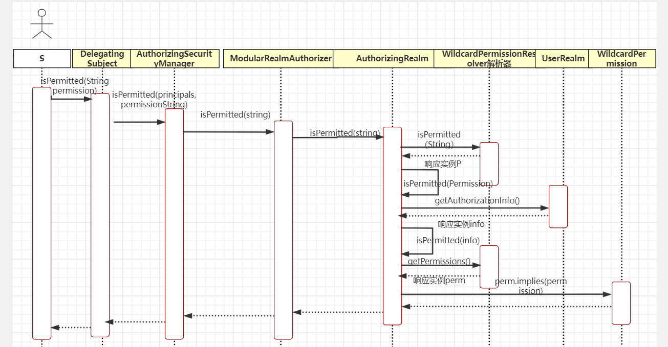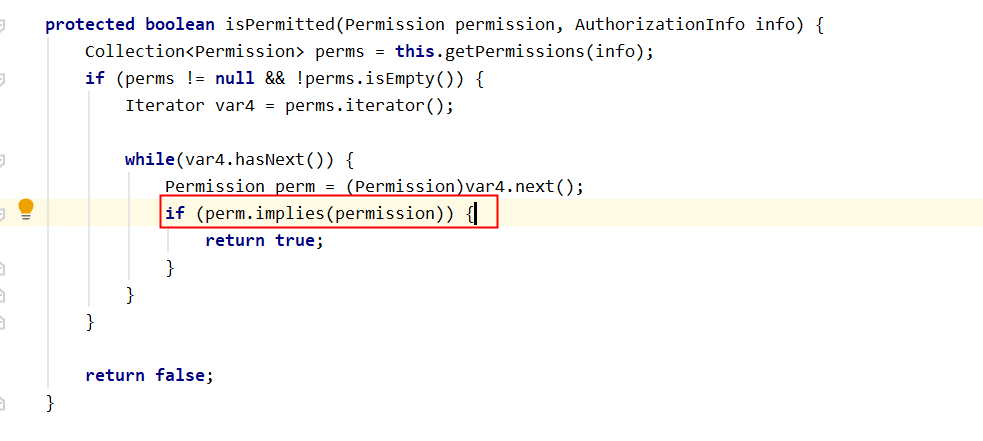 返回至isPermitted()方法中,执行perm.implies(permission)方法进行比较,perm为用户的权限,permission为接口的权限