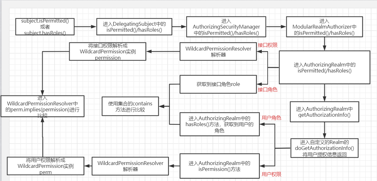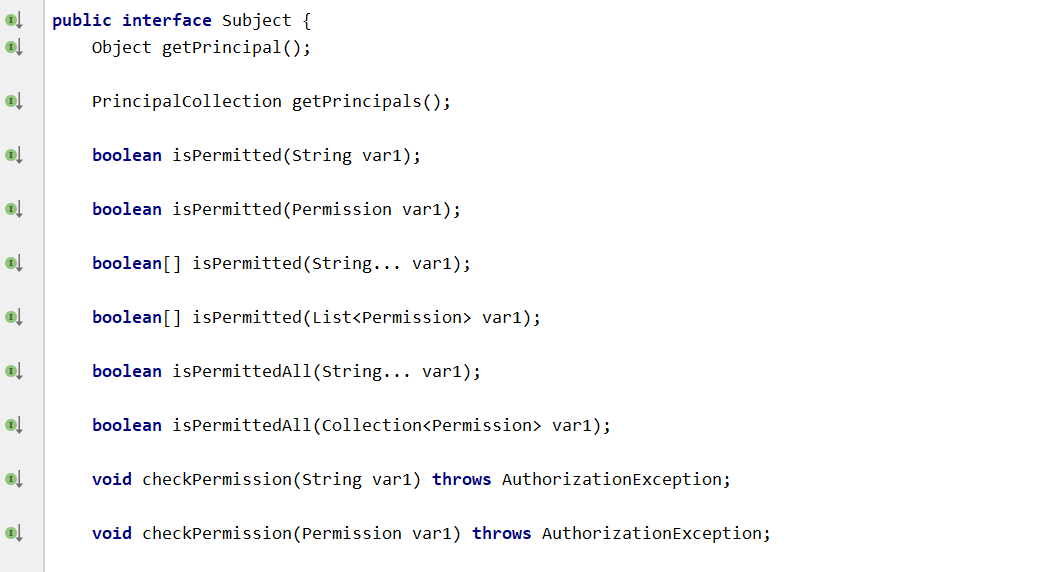 1.在权限和角色校验中,主要以Subject.isPermitted()或者Subject.hasRoles()开始,以下为Subject接口。