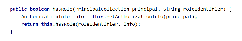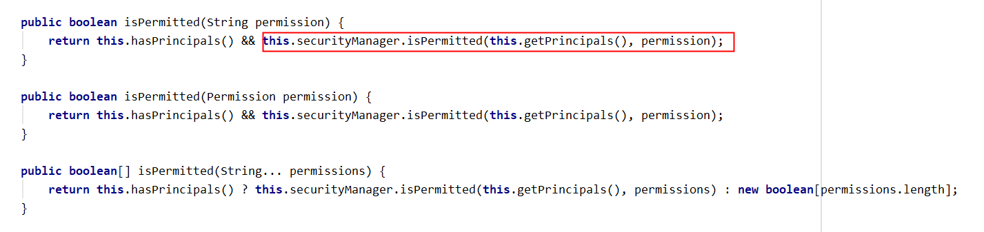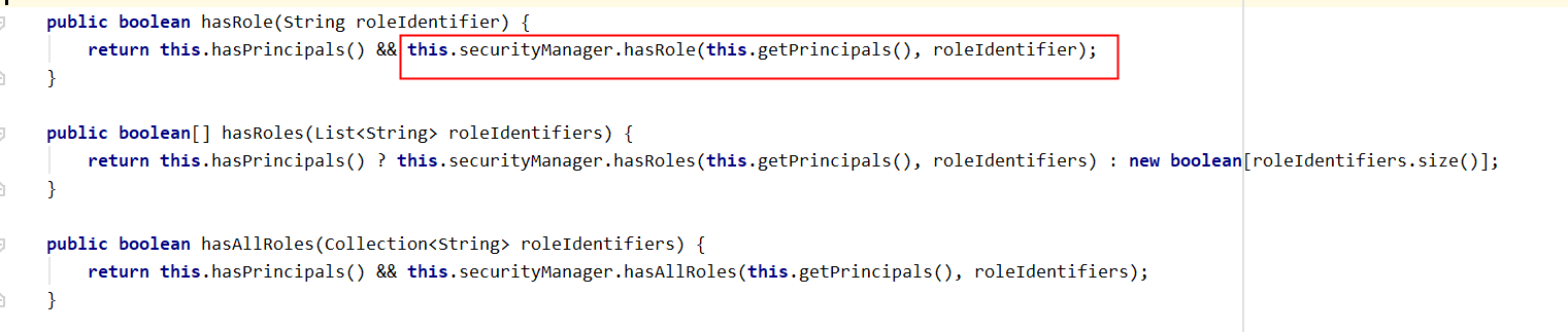 2.进入DelegatingSubject类中的isPermitted(String permission)或者hasRole(String roleIdentifier),执行this.securityManager.hasRole(this.getPrincipals(), roleIdentifier),或者this.securityManager.isPermitted(this.getPrincipals(), permission)方法。
