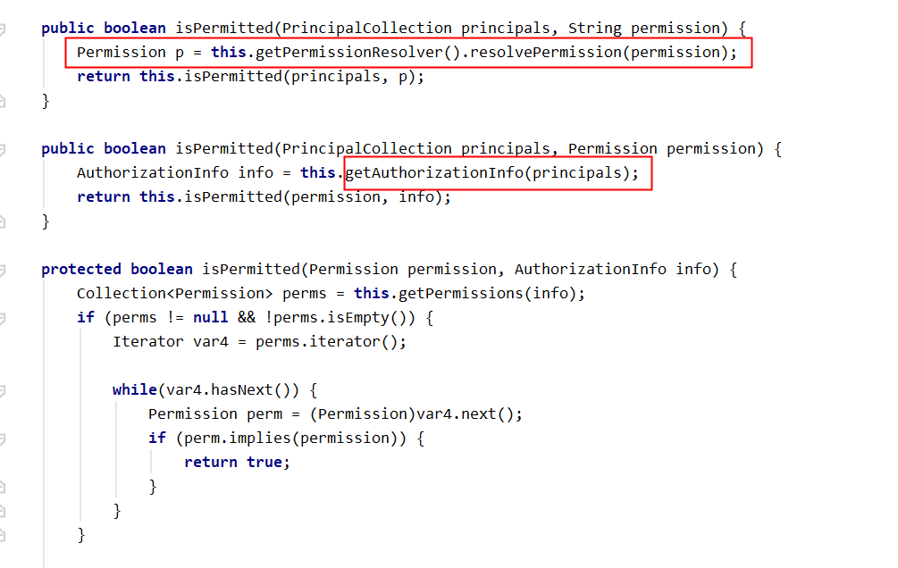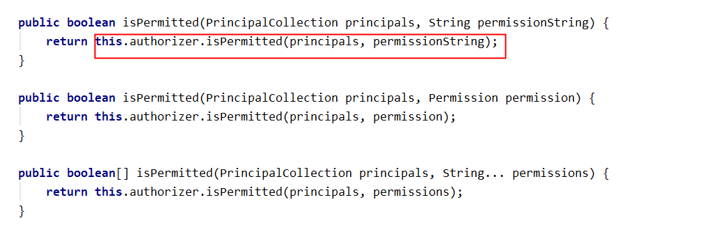 3.AuthorizingSecurityManager为SecurityManager的子类,进入AuthorizingSecurityManager类中的isPermitted()或者hasRole()方法,执行this.authorizer.isPermitted(principals, permissionString);其中authorizer为ModularRealmAuthorzier的实例。