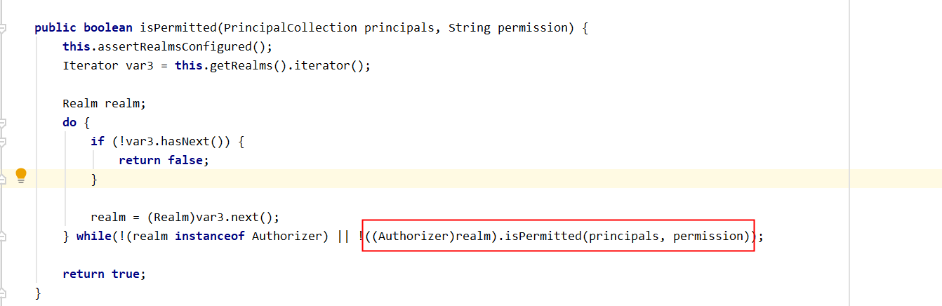 4.进入ModularRealmAuthorzier中的isPermitted(PrincipalCollection principals, String permission)方法后,先获取到所有的realm,进入判断,判断realm是不是Authorizer或者Authorizer子类的实例,不是的话,进行循环,获取到下一个realm,若是则进行下一个判断,执行isPermitted(principals,permission)方法进行权限校验,用户存在该权限,循环结束,返回true,