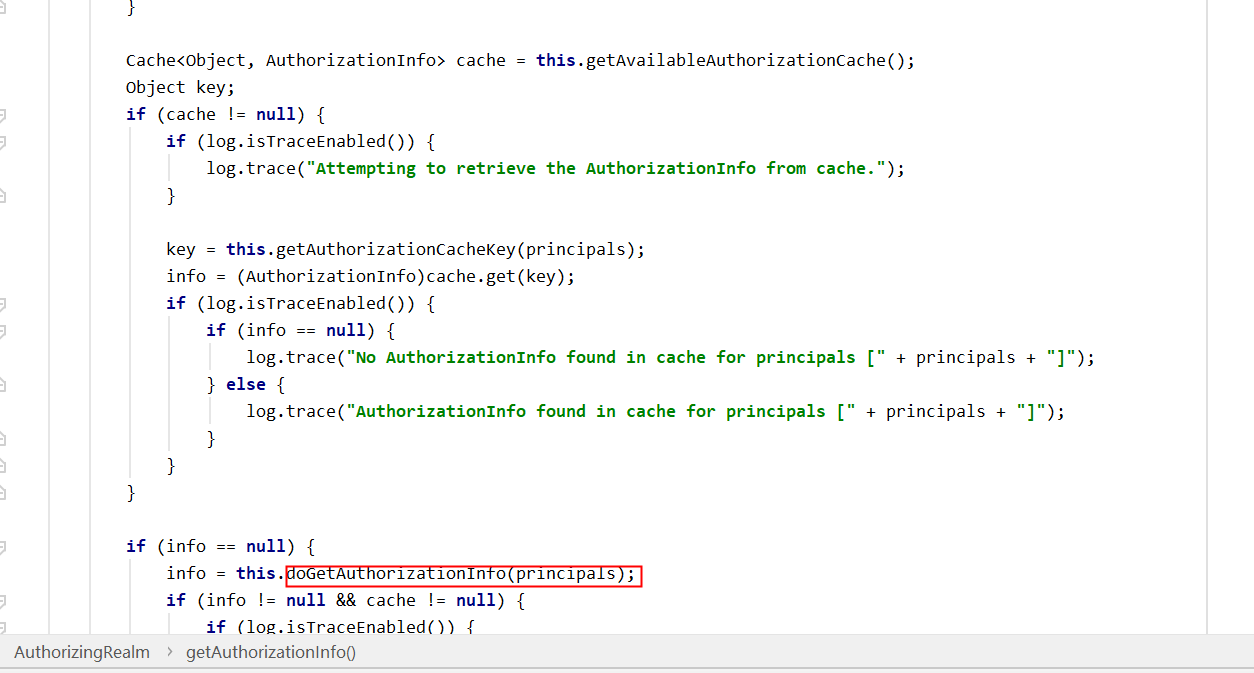 6.进入getAuthorizationInfo()方法,执行doGetAuthorizationInfo()方法,获取用户的权限信息。