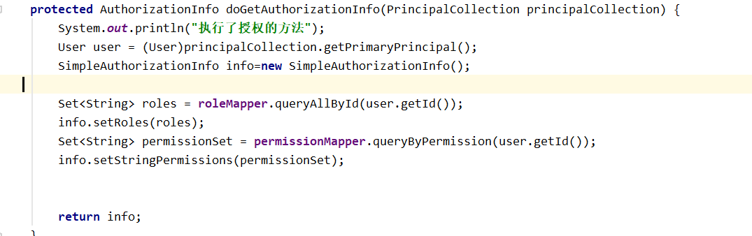 7.doGetAuthorizationInfo()是一个抽象方法,自定义realm继承了AuthorizingRealm,并对doGetAuthorizationInfo()进行了重写,该方法主要就是对用户授权的过程。这里从数据库中获取值并进行授权。