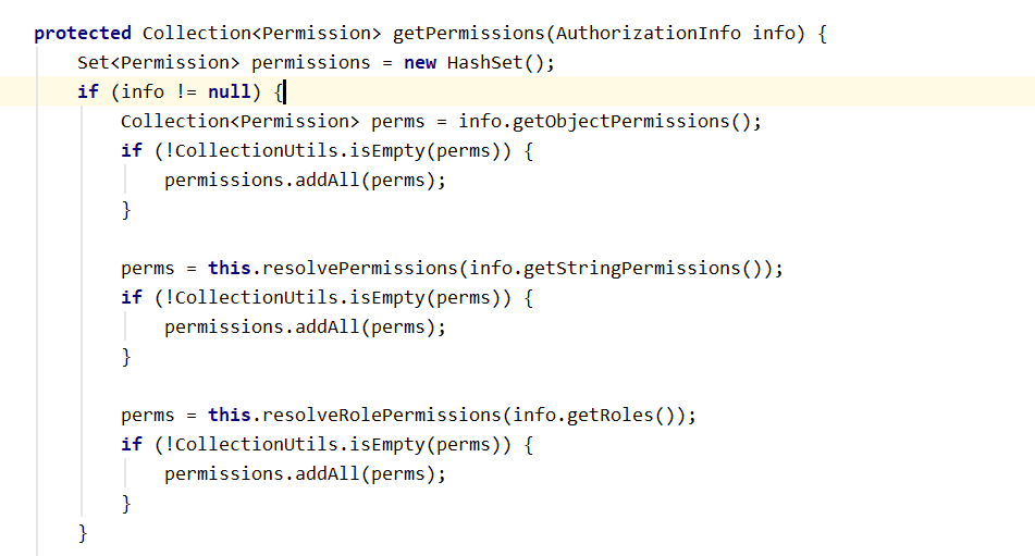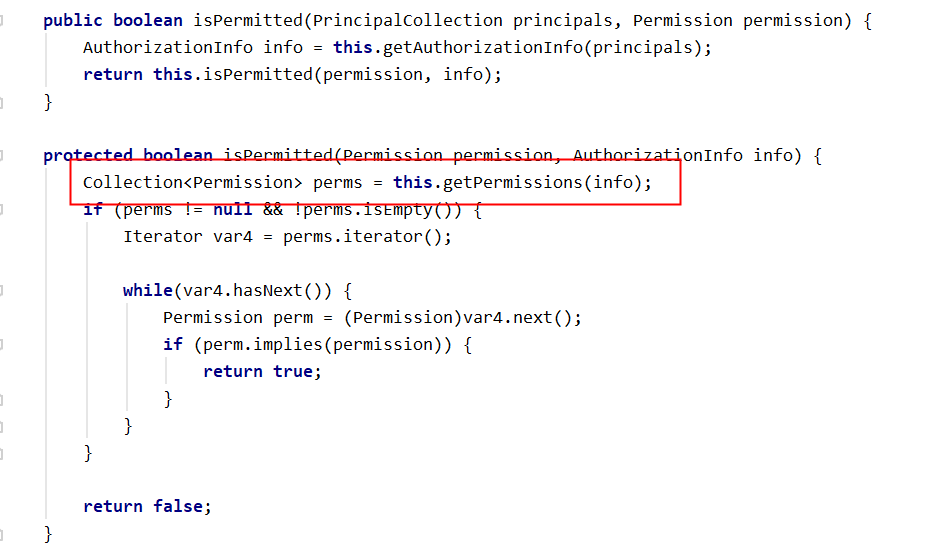 8.1 下面进行权限校验,获取到返回值后,在isPermitted()方法中会执行getPermissions(info)方法,这是对返回值info进行解析的方法。