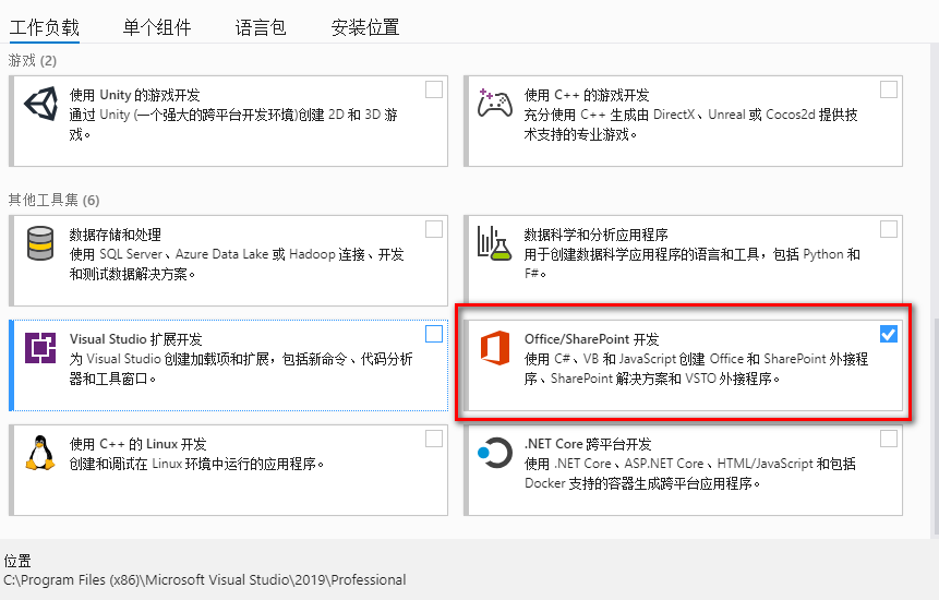 安装时除了必须的组件,软件会默认安装,其余的只需选择如下截图中的Office/SharePoint开发即可。