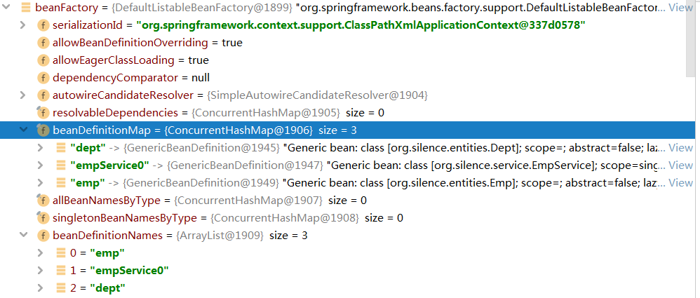 执行完obtainFreshBeanFactory()方法后得到的是一个DefaultListableBeanFactory实例,bean信息以BeanDefinition实例保存在容器的缓存中。