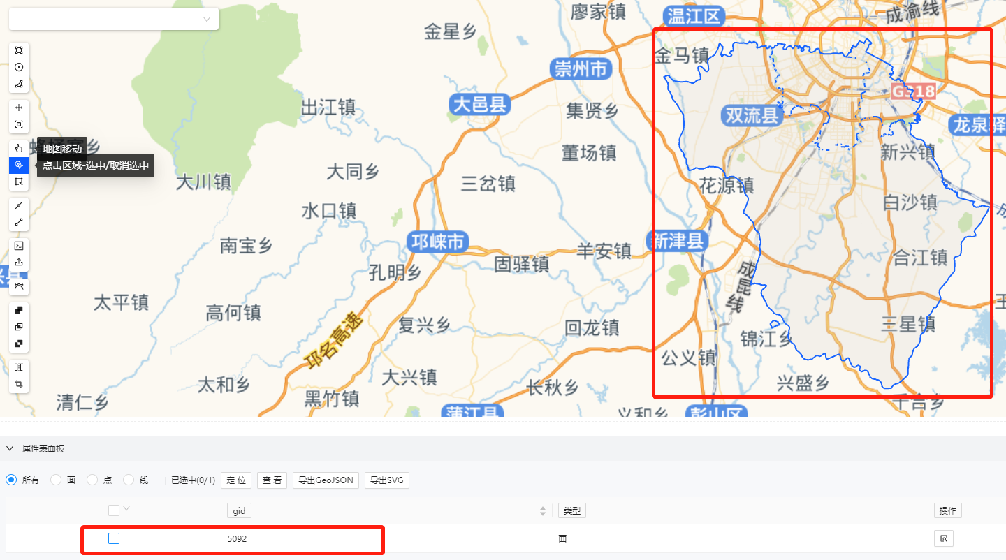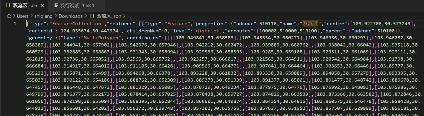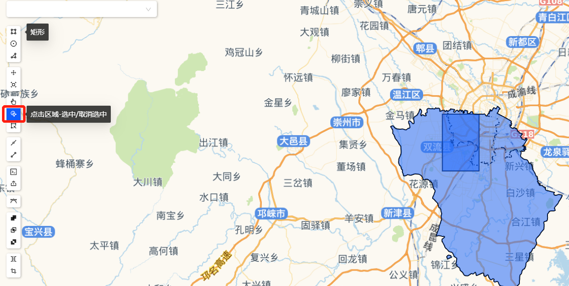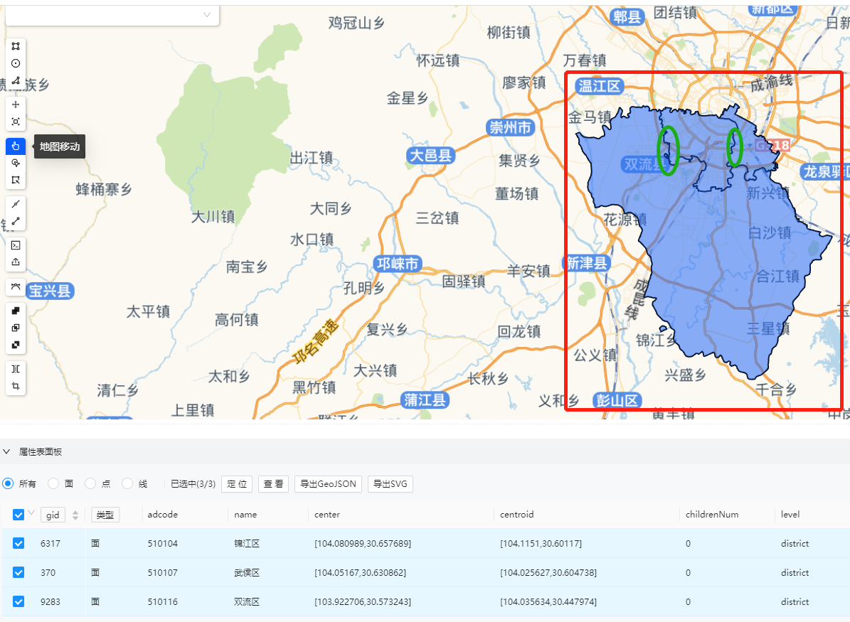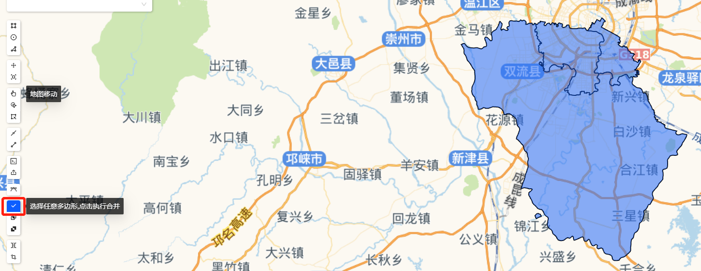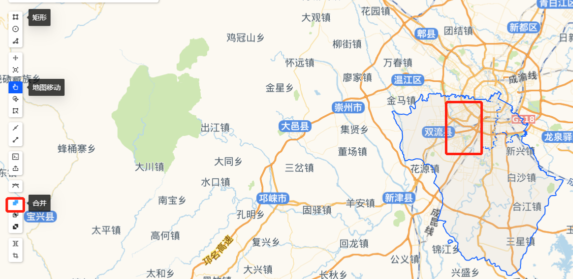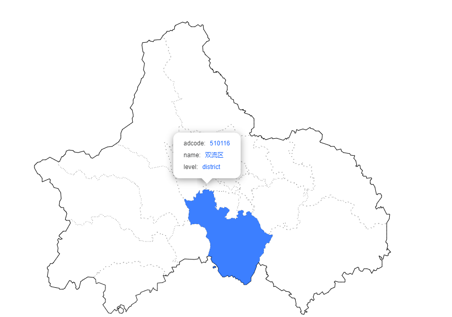 1、需求背景:有一个地图展示页面需要将两个及以上的行政区合并为一个地块来展示,例如将四川省成都市的锦江区、武侯区、双流区三个区合并为一个地块: