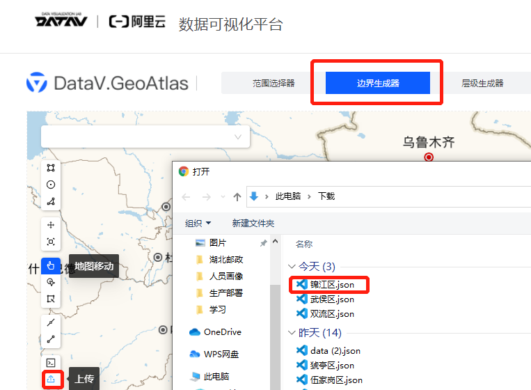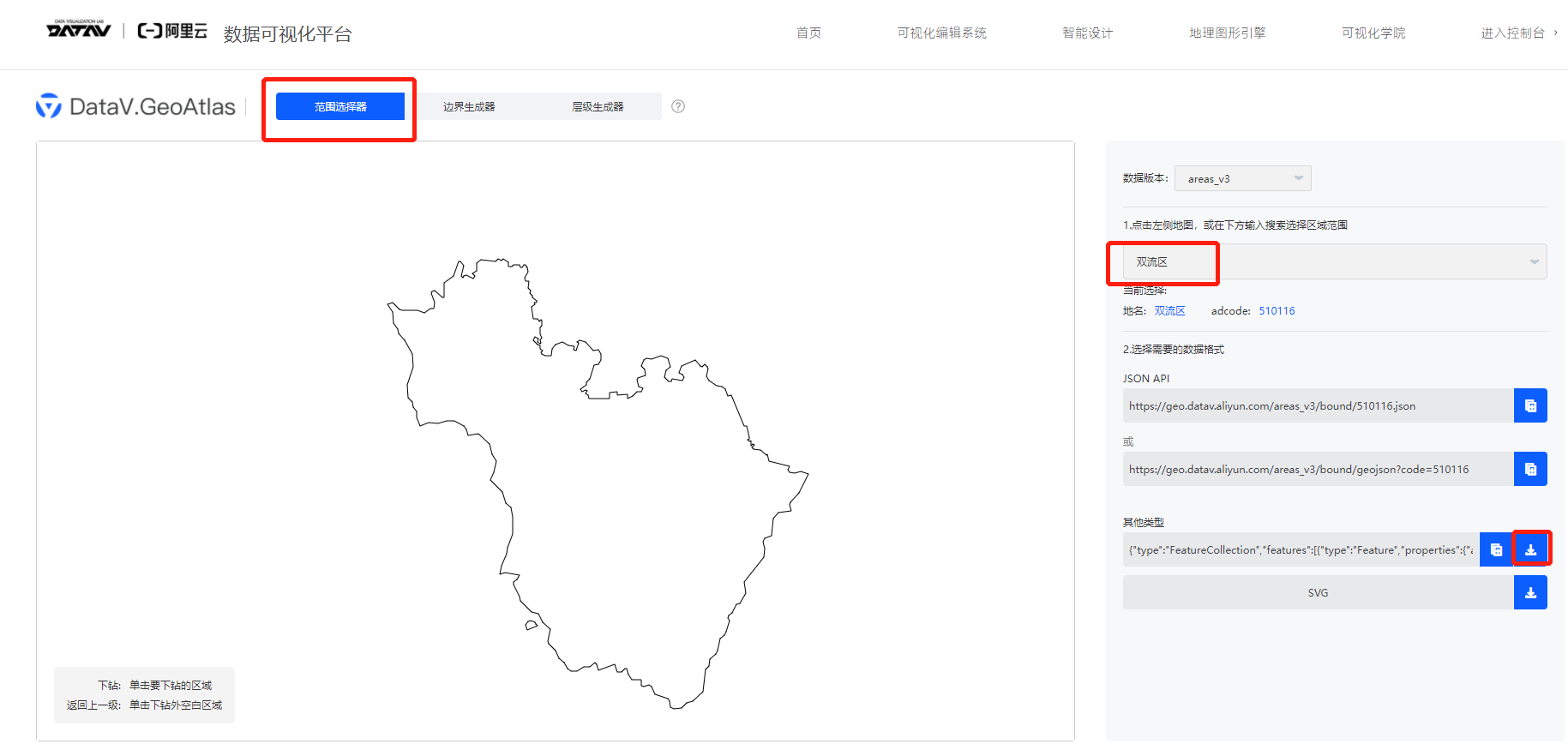 我们需要用到阿里云的DataV.GeoAtlas这个网页地图编辑工具,首先通过“范围选择器"下载这三个区的边界数据文件: