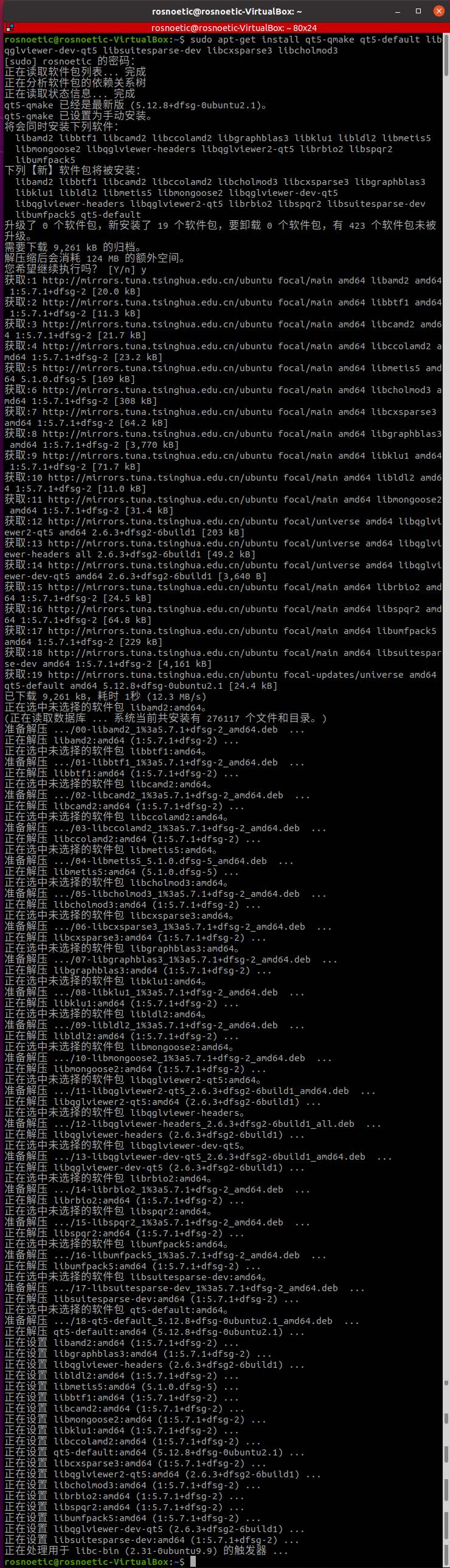 rosnoetic@rosnoetic-VirtualBox:~$ sudo apt-get install qt5-qmake qt5-default libqglviewer-dev-qt5 libsuitesparse-dev libcxsparse3 libcholmod3