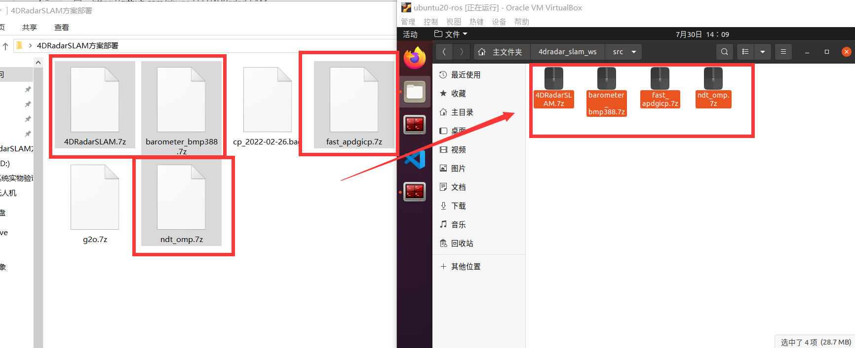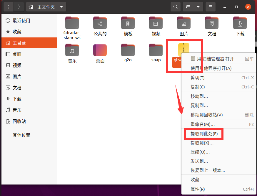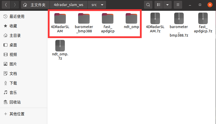 将7z压缩包拖拽至/4dradar_slam_ws/src文件夹下,点击压缩包,右键,选择”提取到此处”: