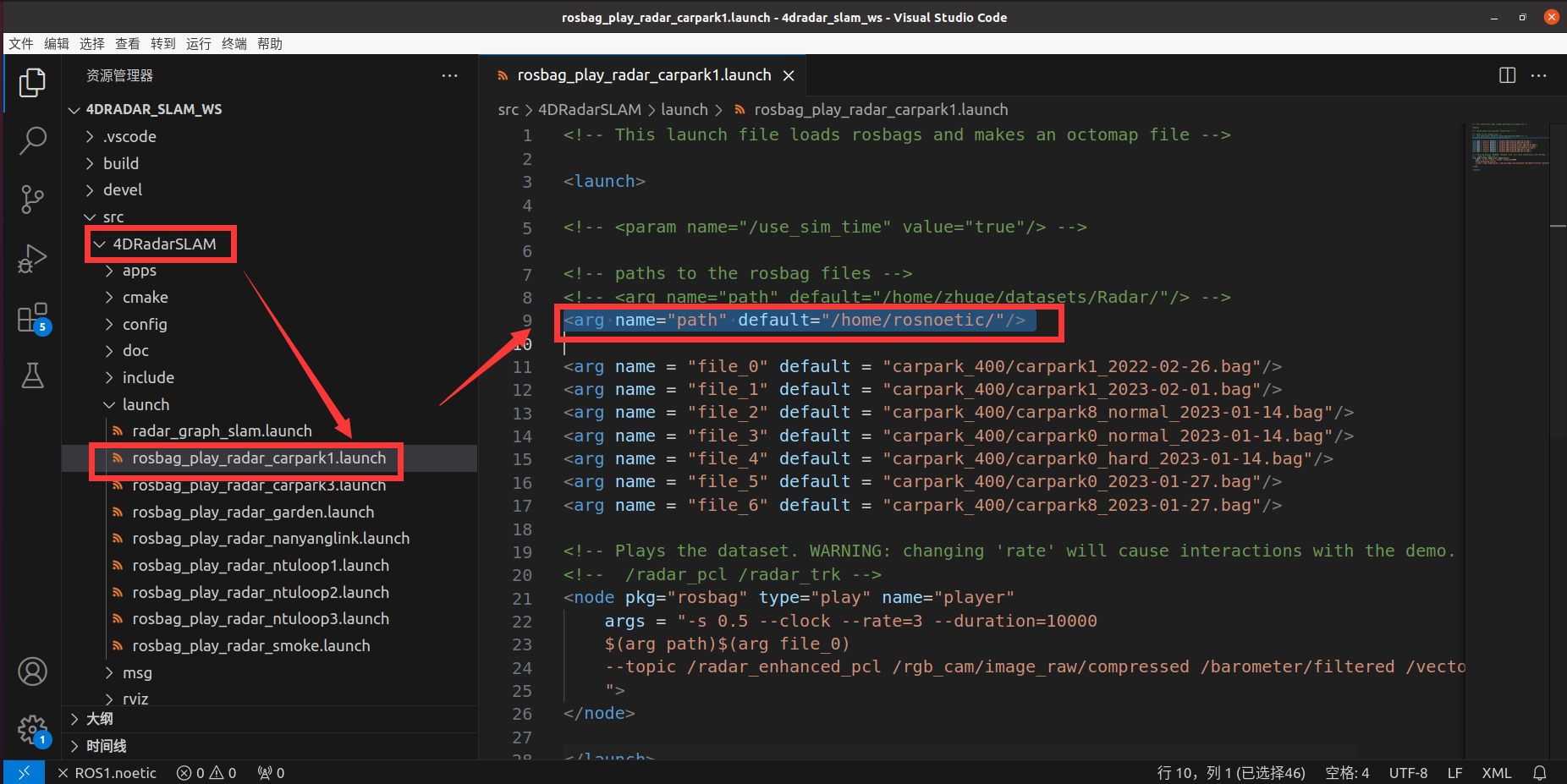 修改launch文件夹中 rosbag_play_radar_carpark1.launch 文件中路径